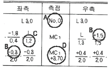 다음 표는 임도의 횡단측량 야장이다. A, B, C, D에 대한 설명으로 옳지 않은 것은?