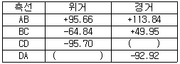 다음과 같은 폐합다각측량 성과표를 이용하여 측점 D의 좌표를 구한 값 중 옳은 것은?(단, A점의 좌표는 0,0 이고, 위ㆍ경거의 오차는 없는 것으로 한다.)
