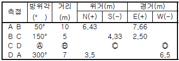 트래버스 측량을 실시한 바 폐합된 지역의 측량시 장애물로 인하여 측선 CD의 방위각 및 거리를 측정하지 못하였다. 측량결과가 아래의 표와 같을 경우 빈칸 측선 CD의