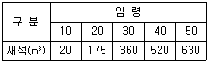아래와 같은 수확표가 있다. 수확표에 의한 방법으로 법정축적을 계산하면 얼마인가?(단, 산림면적 100ha, 윤벌기 50년)