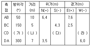트래버스 측량 결과가 아래의 표와 같을 경우 ( )에 값으로 옳지 않은 것은? (단, 위 · 경거 오차는 없음)