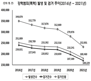 「2022년 범죄백서」에 제시된 강력범죄(폭력) 발생 및 검거 추이에 관한 설명으로 옳은 것은?
