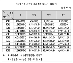 『2024 범죄백서』에 제시된 마약류사범 죄명별 검거 현황(2014년~2023년)에 관한 설명으로 옳은 것은?