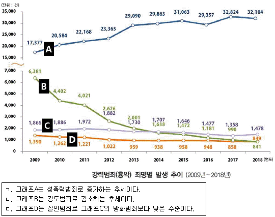 다음은「2019 범죄백서」에서 제시한 강력범죄(살인, 강도, 성폭력, 방화)의 추세이다. 다음 설명으로 옳은 것을 모두 고른 것은?