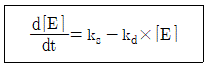 세포 내 효소양의 변화율 (d[E]/dt)은 다음과 같이 나타낼 수 있다. 정상상태 하에서 효소 합성반응률 상수(ks)의 값이 2x10-5 mM/s 이라면, 효소의 농도가 0.1 mM 일 때 효소 분해반응률 상수(kd)의 값은 얼마인가?