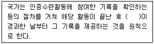 청소년활동진흥법령상 인증수련활동의 기록 유지ㆍ관리 등에 관한 내용이다. ( )에 들어갈 내용은?(관련 규정 개정전 문제로 여기서는 기존 정답인 3번을 누르면 정답 처리됩니다. 자세한 내용은 해설을 참고하세요.)