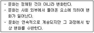 다음의 특징이 나타내는 문화의 일반적 속성은?