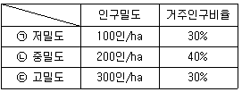 아래의 조건에 따른 밀도별 주거지역의 토지수요 예측 값이 옳은 것은? (단, 목표연도의 예측인구는 200000인이다.)