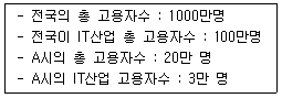 아래와 같은 조건에서 A시의 IT산업 입지계수(LQ : Location Quotient)는?