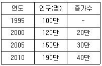 다음 자료를 이용하여 선형모형(직선법)에 의해 추계한 2015년의 인구는? (단, 기준년도는 1995년이다.)