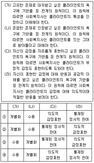 (가)~(라)에 해당하는 비스텍(Biestek)의 사회복지실천 관계의 원칙을 바르게 나열한 것은?