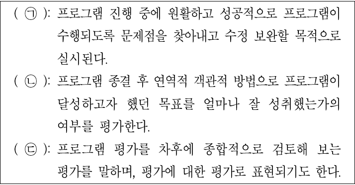 다음 괄호 안에 들어갈 사회복지프로그램 평가유형을 순서대로 바르게 나열한 것은? (순서대로 ㉠-㉡-㉢)
