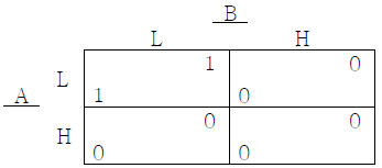 한 시장에 두 기업 A, B가 존재한다. 각 기업은 두 가지 생산 전략 L, H 중 하나를 선택할 수 있다. 두 기업의 생산 전략 선택에 따른 보수는 다음 표와 같다. (단, 표에서 각 셀 좌 하단의 숫자는 기업 A의 보수를, 우 상단의 숫자는 기업 B의 보수를 나타낸다.)