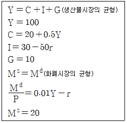 다음의 폐쇄경제 모형에서 생산물시장과 화폐시장을 동시에 균형시키는 물가수준은? (단, Y는 국민소득, C는 소비, I는 투자, G는 정부지출, r은 이자율, Md는 명목화폐수요, Ms는 명목화폐공급, P는 물가수준이다.)