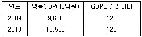2009년과 2010년의 명목GDP와 GDP디플레이터가 다음 표와 같다.