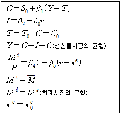 다음 모형에 기초하여 분석할 때, 물가수준-국민소득 평면에서 총수요곡선이 우하향하는 이유를 가장 적절하게 설명한 것은? (단, Y는 소득, C는 소비, I는 투자, r은 실질 이자율, T는 조세, G는 정부지출, P는 물가수준, πe는 예상물가상승률, βi,i=0,…,5,는 양의 계수, Md는 명목 화폐수요, MS는 명목 화폐공급이며