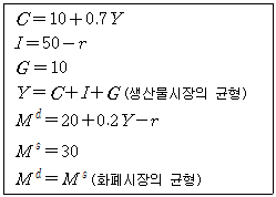 중앙은행은 확장적 통화정책을 실시하여 균형국민소득을 60만큼 더 증가시키고자 한다. 경제모형이 다음과 같을 때 중앙은행은 통화량을 현재의 수준에서 얼마만큼 더 증가시켜야 하는가? (단, Y는 국민소득, C는 소비, I는 투자, G는 정부지출, r은 이자율, Md는 화폐수요, MS는 화폐공급이며, 물가수준은 고정되어 있다.)