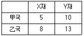 甲국과 乙국의 무역 개시 이전의 X재와 Y재에 대한 단위당 생산비가 다음과 같다. 무역을 개시 하여 두 나라 모두 이익을 얻을 수 있는 교역조건(PX/PY)에 해당하는 것은? (단, PX는 X재의 가격이고, PY는 Y재의 가격이다.)