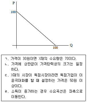 다음 그림은 X재에 대한 수요곡선이다. 다음 설명 중 옳은 것을 모두 고른 것은? (단, X재는 정상재이다.)