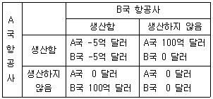 민간항공기는 A국과 B국에서만 생산한다. 두 국가 항공사의 보수(이윤)행렬이 다음과 같다. 만일 두 나라 정부는 자국 항공사가 생산할 경우 각각 10억 달러의 생산보조금을 지급할 때 내쉬균형은 무엇인가?