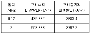 2MPa의 고압증기를 0.12MPa로 감압하여 사용하고자 한다. 감압밸브 입구에서의 건도가 0.9라고 할 때 감압 후의 건도는? (단, 감압과정을 교축과정으로 본다. 압력에 따른 비엔탈피는 다음과 같다.)