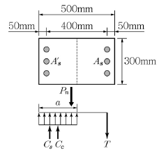 그림과 같은 정사각형 띠철근 기둥(단주)에 편심을 갖는 공칭 축하중 Pn 이 작용하여 압축응력블록의 깊이 a가 255mm이라면 인장철근력 T의 크기는? (단, fck=20/0.85MPa, a=0.85×300mm, AsA's=1,000mm2, fy=400MPa, Es=2×105MPa이다.)