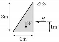 <보기>와 같은 중력식 옹벽의 무게 W=90kN이고 옹벽에 작용하는 수평력 H=20kN일 때 전도에 대한 안전율과 활동에 대한 안전율은? (단, 옹벽의 무게 및 수평력은 단위폭 당 값이며 옹벽의 저판 콘크리트와 흙 사이의 마찰계수는 0.4이다.)