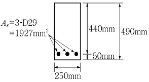 <보기>와 같이 직사각형 단면보가 3개의 D29 인장철근으로 보강되어 있을 때 단면 중립축의 깊이는 압축연단으로부터 약 얼마인가? (단, 콘크리트의 설계기준압축강도(fck)는 28MPa이며 철근의 설계기준항복강도(fy)는 400MPa이다.)