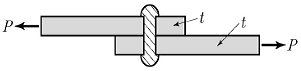 <보기>와 같은 리벳이음에서 판이 지압에 의해 파괴되기 위한 판 두께 t는 얼마 이하인가? (단, 직경 ø=20mm, 허용전단응력 va=120MPa, 허용 지압응력 fba=300MPa이다.)