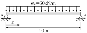 다음 그림과 같은 자중을 포함한 계수등분포하중 wu을 받고 있는 단철근 직사각형 철근콘크리트 단순보에서, 지점 A로부터 최소전단철근을 포함한 전단철근이 배근되는 점까지의 거리 x는? (단, 보통중량 콘크리트를 사용하고, fck=36MPa, 단면의 폭 b=400mm, 유효깊이 d=400mm이다.)
