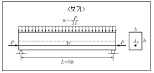 <보기>와 같은 경간 L인 단순보에 등분포하중(자중 포함) w=P/3L이 작용하며, PS강재는 편심 거리 e로 직선배치 되어 프리스트레스 힘 P가 작용하고 있다. 이 보의 중앙부하단에서 휨에 의한 수직응력이 0(zero)이 되려면 편심거리 e의 크기는? (단, 경간 L은 단면 높이 h의 8배이다.)