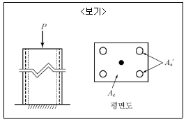 <보기>와 같이 철근콘크리트 기둥(단주)의 중심에 집중하중 P가 작용한다. 하중과 응력의 평형을 고려할 때 탄성과 비탄성영역의 전체 범위에 대해 타당하게 사용할 수 있는 식으로 알맞은 것은? (단, fs′=철근응력, fc=콘크리트 응력, n=Es/Ec, Ac=콘크리트 면적, As′=압축철근 면적, Ag=Ac+Ac'이다.)