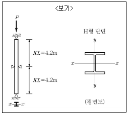 <보기>와 같이 H형 단면 압축재의 중간 위치에 약축(y축)에 대한 지지대가 설치되어 있을 때, 압축부재의 설계강도를 계산하기 위해 사용되는 세장비 kl/r은? (단, 부재 내 강축(x축) 방향으로 중간지지(intermediate bracing)는 없고, H형 단면에 대하여 rx=120mm, ry=50mm이다.)