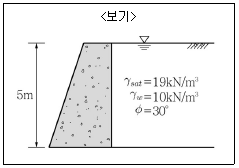 <보기>와 같은 옹벽에 작용하는 주동토압의 크기는? (단, 벽면마찰각과 옹벽 연직변위는 무시한다.)
