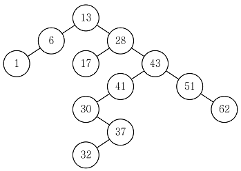 다음 이진검색트리에서 28을 삭제한 후, 28의 오른쪽 서브트리에 있는 가장 작은 원소로 28을 대치하여 만들어지는 이진검색트리에서 41의 왼쪽 자식 노드는?