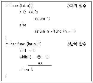 다음 재귀 함수를 동일한 기능의 반복 함수로 바꿀 때, ㉠과 ㉡에 들어갈 내용을 바르게 연결한 것은? (순서대로 ㉠, ㉡)