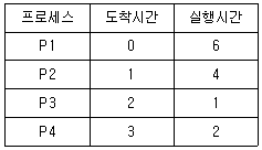 다음은 프로세스가 준비 큐에 도착하는 시간과 프로세스를 처리하는데 필요한 실행시간을 보여준다. 비선점 SJF(Shortest Job First) 스케줄링 알고리즘을 사용한 경우, P1, P2, P3, P4 프로세스 중에서 두 번째로 실행되는 프로세스는? (단, 프로세스 간 문맥 교환에 따른 오버헤드는 무시하며, 주어진 4개의 프로세스 외에 처리할 다른 프로세스는 없다고 가정한다)