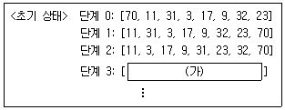 다음은 입력으로 들어온 배열 [70, 11, 31, 3, 17, 9, 32, 23]에 대하여 오름차순으로 버블 정렬 알고리즘의 수행 과정을 단계별로 나타낸 것으로 (가)에 해당하는 것은?