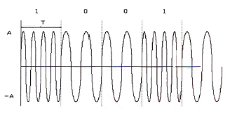 정현파의 주파수에 정보를 싣는 ASK 방식으로 2가지 진폭을 이용한다.