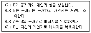 A가 B에게 암호화 메시지를 보내는 경우 공개키 암호화 단순모델의 동작절차로 적합하게 나열한 것은?