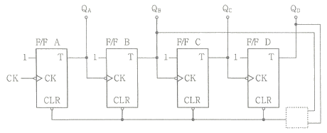 다음 그림은 T F/F을 이용한 비동기 10진 상향계수기이다. 계수값이 10이 되었을 때 계수기를 0으로 하기 위해서는 전체 F/F을 clear시켜야 하는데 이렇게 하기 위해 빈칸에 알맞은 게이트는?