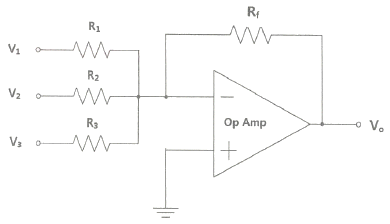 다음 연산증폭기 회로에서 R1=50[kΩ], R2=100[kΩ], R3=10[kΩ], Rf=10[kΩ]이고, V1=3[V], V2=2[V], V3=8[V]일 때 출력전압 VO는?