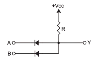 다음 회로에서 VCC=5[V]일 때 출력 전압은? (단, A=5[V], B=0[V], 다이오드의 VT=0[V]이다.)