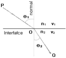 스넬의 법칙(Snell's law)이란 광선 또는 전파가 서로 다른 매질의 경계면에 입사하여 통과할 때 입사각과 굴절각과의 관계를 표현한 법칙이다. 다음 그림과 같이 굴절률이 n1과 n2로 서로 다른 두 매질이 맞닿아 있을 때 매질을 통과하는 빛의 경로는 매질마다 광속이 다르므로 휘게 되는데, 그 휜 정도를 빛의 입사 평면상에서 각도로 표시하면 과 가 된다. 이때 스넬의 법칙으로 n1, n2 Ɵ1, Ɵ2의 상관관계를 올바르게 정의한 것은?