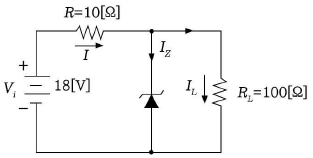다음 회로에서 제너 다이오드에 흐르는 전류는? (단, 제너 다이오드의 파괴전압은 10[V]이다.)