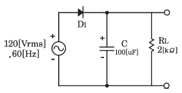 다음 그림과 같은 회로의 입력에 120[Vrms], 60[Hz] 정현파 신호가 인가되었을 경우, 부하에 걸리는 직류전압은 약 얼마인가? (단, 다이오드에 걸리는 전압강하는 무시한다.)