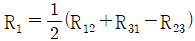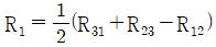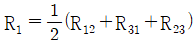 접지 도체 P1,P2, P3의 각 접지저항이 R1, R2, R3이다. R1의 접지저항(Ω)을 계산하는 식은? (단, R12 = R1 + R2, R23 = R2 + R3, R31 = R3 + R1 이다.)