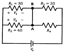 다음과 같이 저항이 연결된 회로의 전압 V1과 V2의 전압이 일치할 때, 회로의 합성저항은 약 Ω 인가?