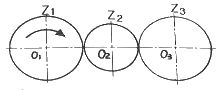 그림과 같은 기어열에서 각 기어의 잇수가 Z1=40, Z2=20, Z3=40 일 때 O1 기어를 시계방향으로 1회전 시켰다면 O3 기어는 어느 방향으로 몇 회전 하는가?