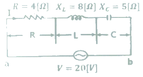 그림과 같은 회로에서 R=4[Ω], XL=8[Ω], Xc=5[Ω]의 RLC직렬회로에 20V의 교류를 가할 때 용량성 리액턴스 Xc에 걸리는 전압[V]은?